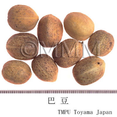 | Remarks | Badou (巴豆) is generally imported in the form of a fruit. The Pharmacopoeia of the People's Republic of China defines mature fruit of Croton tiglium L. (Jap. name: Hazu) as Badou. Its medicinal properties are drastic and intestinal hemorrhage can be a side effect. Recently, it was found that the component of the methanol extract from Badou inhibits cytopathy caused by the HIV-1 virus. (C2,C3) | ||||