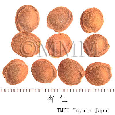 | Remarks | The Japanese Pharmacopoeia defines the origin of Xingren as seed of P. armeniaca and its variant P. armeniaca var. ausu, and P. sibirica L. (Jap. name: Mōkoanzu). The Pharmacopoeia of People's Republic of China defines the origin of Kuxingren as seed of P. mandshurica (Maxim.) Koehne (Jap. name: Manshūanzu), in addition to the above. In China, "Tianxingren" (used for food) is distinguished from "Kuxingren" which is used as medicine. Their amygdalin content are different. The amygdalin content in "Kuxnigren" is 3 to 5% and that in "Tianxingren" is 0.11%. The amygdalin is transformed into mandelonitorile by emulsin (beta-glucosidase) etc., which coexist in Xingren. Finally, it generates benzaldehyde, glucose and hydrocyanic acid. "Xingrenshui" (Jap. name: Kyōninsui) is a cough remedy and expectorant drug, which has major components of benzaldehyde and hydrocyanic acid. "Kyōninsui" is manufactured by steam distillation of "Xingren" after removing the fatty oil. "Taoren" (Peach Kernel) is another crude drug of semens which belongs to genus Purunus and contains amygdalin (approximately 2%). Xingren has the benefit of promoting the normal flow of vital energy and water in the Five Elements. It is used for the syndrome of upper burner and applied for the constipation with stagnation of qi. Meanwhile, "Taoren" has the benefit of promoting circulation of blood. It is used for the syndrome of lower burner and applied to the constipation with blood stasis. | |||||