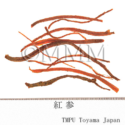 | Remarks | There are two kinds of Hongshen. One is steamed and dried Hongshen which fine roots have not been removed (Japanese Hongshen). The other is dried and pressed Hongshen without fine roots (North Korean and Korean Hongshen). In China, the processed Hongshen with relatively long branching roots is called "Biantiao Hongshen" and the one without fine roots is called "Hongshenxu". | |||