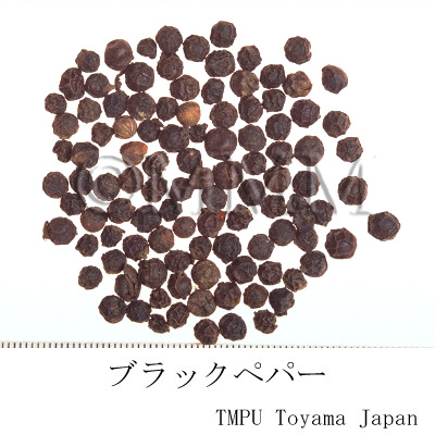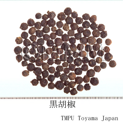 | Remarks | Black pepper is the dried immature fruit. White pepper is the dried mature fruit after removing the epicarp. Black pepper: Eared immature fruits are harvested. Then the fruit is separated from the ear by hand kneading, immersed in boiling water until the surface turns to black, lifted from the water and dried. White pepper: Mature fruits are bagged and immersed in flowing water for a week. Then the pericarp and sarcocarp are removed. The remaining seed is dried. Alternatively, it is made by just removing the pericarp and sarcocarp of Black pepper. Hujiao originally came from Southern India to Europe in about B.C.400, and to China in Tang Dynasty. Hujiao opened the Age of Geographical Discovery (the era started by the discovery of shipping route to India). At the time, during late 15th to 16th century, its value was equivalent to gold. | |||||