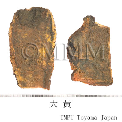 | Quality for selection | Good Dahuang has a characteristic golden yellow pattern and star-like spots. The internal part is stiff and contains oil with a clean aroma. It is sticky when chewed. (NI) | ||||||
