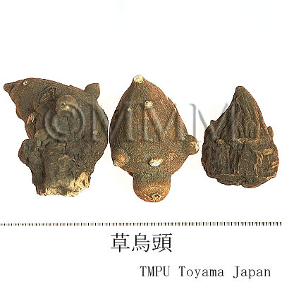 Remarks- The tubers of wild Aconitum have respective names depending on the production area and species, as follows: Sōuzu (Jap. name), Caowu, Wuyao, Jinniuqi, Dacaowu, Xiaoheiniu, Xuewu, Huangcaowu, Tengcaowu, Wanwuyao, Kaenshi (Jap. name), Tiebangchui.