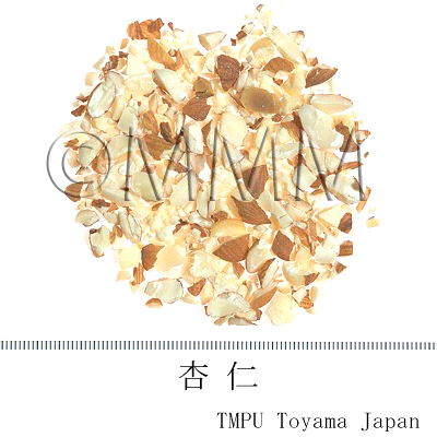 | Remarks | The Japanese Pharmacopoeia defines the origin of Xingren as seed of P. armeniaca and its variant P. armeniaca var. ausu, and P. sibirica L. (Jap. name: Mōkoanzu). The Pharmacopoeia of People's Republic of China defines the origin of Kuxingren as seed of P. mandshurica (Maxim.) Koehne (Jap. name: Manshūanzu), in addition to the above. In China, "Tianxingren" (used for food) is distinguished from "Kuxingren" which is used as medicine. Their amygdalin content are different. The amygdalin content in "Kuxnigren" is 3 to 5% and that in "Tianxingren" is 0.11%. The amygdalin is transformed into mandelonitorile by emulsin (beta-glucosidase) etc., which coexist in Xingren. Finally, it generates benzaldehyde, glucose and hydrocyanic acid. "Xingrenshui" (Jap. name: Kyōninsui) is a cough remedy and expectorant drug, which has major components of benzaldehyde and hydrocyanic acid. "Kyōninsui" is manufactured by steam distillation of "Xingren" after removing the fatty oil. "Taoren" (Peach Kernel) is another crude drug of semens which belongs to genus Purunus and contains amygdalin (approximately 2%). Xingren has the benefit of promoting the normal flow of vital energy and water in the Five Elements. It is used for the syndrome of upper burner and applied for the constipation with stagnation of qi. Meanwhile, "Taoren" has the benefit of promoting circulation of blood. It is used for the syndrome of lower burner and applied to the constipation with blood stasis. | |||||