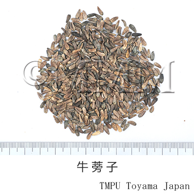 | Clinical application | As an antifebrile, antidote, expectorant and antiinflammatory drug, Niubangzi is applied for cold, cough, sore throat, persisting sputum, measles, carbuncles and sores. | |||||