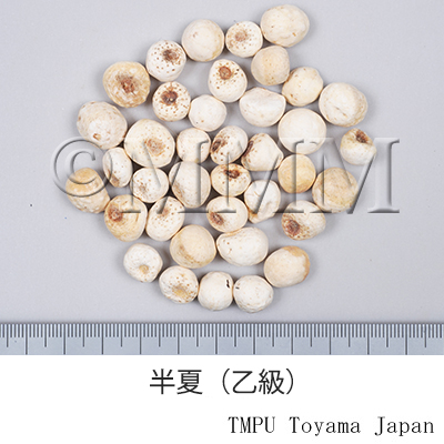 Remarks"Banxia (半夏)" is sometimes used after being processed. Processed "Banxia" consists of "Fabanxia (法半夏)" and "Jiangbanxia (姜半夏)". "Fabanxia (法半夏)" is processed with "Gancao (glycyrrhiza/liquorice)" and burnt lime. It is often used for eliminating dampness and resolving phlegm. "Jiangbanxia (姜半夏)" is processed with "Shengjiang (fresh ginger)" and alum. It is often used for lowering the adverse flow of qi to stop vomiting. In rare cases, the tuber of Pinellia pedatisecta Schott, P. tripartita Schott (Jap. name: Ōhange) or Arisaema spp. are blended into Chinese Banxia in the market. "Shuy-banxia (水半夏)" is the tuber of Typhonium sp.