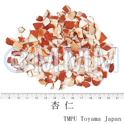 | Remarks | The Japanese Pharmacopoeia defines the origin of Xingren as seed of P. armeniaca and its variant P. armeniaca var. ausu, and P. sibirica L. (Jap. name: Mōkoanzu). The Pharmacopoeia of People's Republic of China defines the origin of Kuxingren as seed of P. mandshurica (Maxim.) Koehne (Jap. name: Manshūanzu), in addition to the above. In China, "Tianxingren" (used for food) is distinguished from "Kuxingren" which is used as medicine. Their amygdalin content are different. The amygdalin content in "Kuxnigren" is 3 to 5% and that in "Tianxingren" is 0.11%. The amygdalin is transformed into mandelonitorile by emulsin (beta-glucosidase) etc., which coexist in Xingren. Finally, it generates benzaldehyde, glucose and hydrocyanic acid. "Xingrenshui" (Jap. name: Kyōninsui) is a cough remedy and expectorant drug, which has major components of benzaldehyde and hydrocyanic acid. "Kyōninsui" is manufactured by steam distillation of "Xingren" after removing the fatty oil. "Taoren" (Peach Kernel) is another crude drug of semens which belongs to genus Purunus and contains amygdalin (approximately 2%). Xingren has the benefit of promoting the normal flow of vital energy and water in the Five Elements. It is used for the syndrome of upper burner and applied for the constipation with stagnation of qi. Meanwhile, "Taoren" has the benefit of promoting circulation of blood. It is used for the syndrome of lower burner and applied to the constipation with blood stasis. | |||||