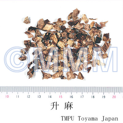 | Clinical application | As an antifebrile, antidote, and anti inflammatory drug, Shengma is applied for fever, headache, pharyngitis, cold, measles, and anal prolapse. | ||||||