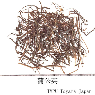 | Remarks | The Pharmacopoeia of the People's Republic of China defines (2020 edi.) defines the whole plant of Taraxacum mongolicum Hand.-Mazz. (Jap. name: Mōko-tampopo), T. borealisinense Kitam. (Jap. name: Shina-tampopo) as "Pugongying" (蒲公英). Others are T. erythropodium Kitag., T. ceratophorum DC., T. pseudo-albidum Kitag., T. pseudo-albidum Kitag. var. lutescens Kitag., T. ohwianum Kitam., T. dissectum Ledeb., T. asiaticum Dahlst., T. cuspidatum Dahlst., T. officinale Weber (Jap. name: Seiyō-tampopo) etc. The above plants are mainly used in northeastern and northern China. TMany commercial products are found to be contaminated. In southern China, the whole plant of Emilia sonchifolia (L.) DC. of family Compositae (Jap. name: Usubeninigana) or Elephantopus scaber L. is known as "Pugongying" or "Tugongying" (土公英) and used. In Yunnan Province, Picris divaricata Vent. is referred to as "Pugongying". In Taiwan, the whole plant of Ixeris chinensis (Thunb.) Nakai (Jap. name: Usagiso) is called "Pugongying". The whole plant of I. laevigata (Blume) Sch.-Bip. ex Maxim. var. oldhami (Maxim.) Kitam. (Jap. name: Atsubanigana) is also used in the same way. The Korean "Pugongying" is mainly the whole plant of T. mongolicum Hand.-Mazz. var. corniculatum Nakai (JP name: Keirin-tampopo), or T. asiaticum Dahlst. etc. In rare cases, the roots are also sold as "Pugongying-gen". In Japan, it is mainly the roots of T. japonicum Koidz. (Jap. name: Kansai-tampopo) and T. officinale, and is called "Hokōeikon" (Pugongying-gen). | ||||||