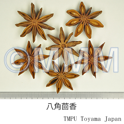 | Remarks | - The benefit of Bajiaohuixiang (Jap. name: Daiuikyō) resembles Xiaohuixiang (Jap. name: Shouikyō). However, Daiuikyō has the heat property which warms the organs strongly, dispels cold and relieves pain. - The fruit of Ilicium religiosum Sieb. et Zucc. (Jap. name: Shikimi), produced in Japan, is the congener of Daiuikyō. Though it resembles Daiuikyō closely, it has a toxic component anisatin. Therefore, it must not be mixed with Daiuikyō. | |||||