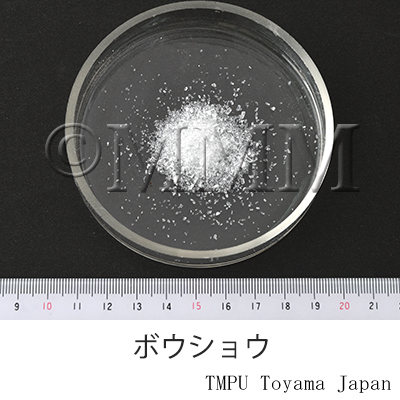 | Remarks | The ancient Mangxiao (芒硝) was the magnesium sulfate crystal, MgSO4・7H2O. It was also called Bagashō (馬牙消), Eishō (英消), Shōseki (消石), etc. Though sodium sulfate is the original mineral of Mangxiao according to the Japanese Pharmacopoeia at present, it should be the original mineral of Bokushō (朴消). Mangxiao stored in the Shosoin Storehouse is magnesium sulfate crystal. |