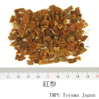 | Remarks | There are two kinds of Hongshen. One is steamed and dried Hongshen which fine roots have not been removed (Japanese Hongshen). The other is dried and pressed Hongshen without fine roots (North Korean and Korean Hongshen). In China, the processed Hongshen with relatively long branching roots is called "Biantiao Hongshen" and the one without fine roots is called "Hongshenxu". | |||