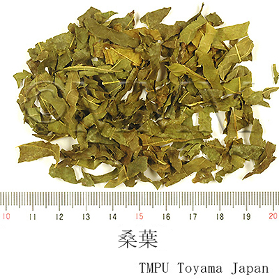 RemarksThe Japanese Sangye (桑葉) is the dried leaf, with or without sprig, of Mori bombycis (Jap. name: Yamaguwa) and Mori alba L. var. multicaulis Loudon (Jap. name: Rōso). It is taken as medicinal tea to prevent palsy and arteriosclerosis.