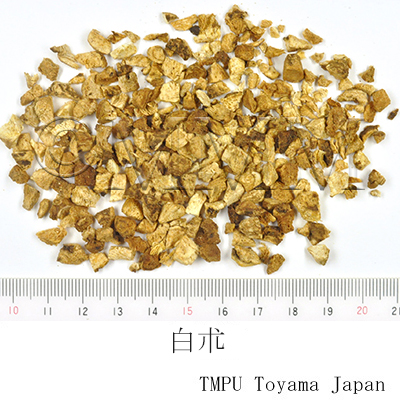 | Remarks | Both Japanese and Korean Baizhu (白朮) are the barked rhizome of Atractylodes japonica, which are called, in Japanese name, "Miyoshibyakujutsu", "Tamabyakujutsu", "Donkonbyakujutsu" and others. Though the origin of all Chinese Baizhu is Atractylodes macrocephala, they have various names such as "Zhezhu", "Tianshengzhu", "Dongzu, "Yezhu" etc. depending on the production areas and the processing methods. These are listed in the Pharmacopoeia of People's Republic of China as Baizhu (Atractylodis Macrocephalae Rhizoma, Largehead Atractylodes Rhizome). In Japan, occasionally, the Japanese Baizhu is called "Wabyakujutsu" and the Chinese one is called "Tōbyakujutsu". The main component of essential oil in both Baizhu is atractylone. The medicinal properties of Baizhu and Cangzhu (蒼朮), a related drug, are the same as long as their actions are to strengthen the function of the stomach and eliminate dampness. However, Baizhu tends to have the advantage of the former property and Cangzhu is said to be good at the latter (to alleviate water retention, inducing diuresis and diaphoresis). Therefore, Baizhu is used to treat deficiency in the spleen of the insufficiency symptom complex, and Cangzhu is used to treat excessive pathogenic heat of excess syndrome. | |||||