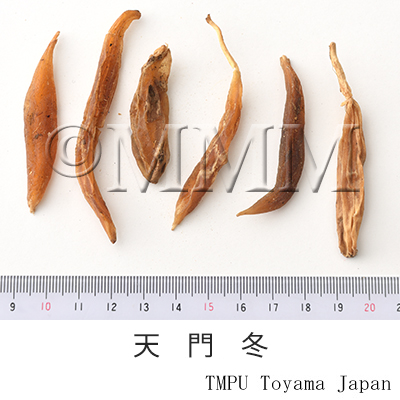 RemarksIn the market, the root of Asparagus cochinchinensis (Lour.) Merr. (Jap. name: Kusasugikazura) as well as that of A. lucidus Lindl. var. pygmaeus Makino, A. filicinum Ham. (Jap. name: Tachitemmondō) and A. schoberioides Kunth (Jap. name: Kijikakushi) may be distributed. Tianmendong has a strong effect of nourishing the lung and kidney. Maimendong (Ophiopogonis Tuber) has an advantage of clearing away heat and relieving dryness of the lung. Both are applied in the combination for the cough of lung tuberculosis.