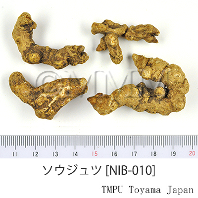 | Remarks | Maozhu (Hancangzhu) is A. lancea (Jap. name: Hosobaokera), produced in Hubei, Jiangxi, Jiangsu Prov. and others. Jincangzhu (Shancangzhu) is A. chinensis (Jap. name: Shinaokera), produced in Hebei, Henan and Jiangxi. North Korean Cangzhu is A. koreana Kitam. (= A. lancea DC.var. simplicifolia Kitam.), Jap. name: Nanman'okera, produced in Jilin, Liaoning, north part of Korean peninsula and Japan. Cangzhu produced in Maoshan of Jiangsu Prov. is very famous for its high quality. Though the cotton-like white separation of the essential oil on the surface is often misjudged as fungus, it is the mixed crystal of beta-Eudesmol and Hinesol, which is a proof of the high quality. Recent report says that A. lancea has three types (Maoshan, Hubei-anhui and Dabeishan) depending on the characteristics of essential oils. A. chinensis also has two types (North and South). Cangzhu originated from A. lancea, A. chinensis and A. koreana contains Atractylodin. They are clearly distinguished from the one originated from A. japonica or A. ovata, which doesn't contain Atractylodin. | |||||