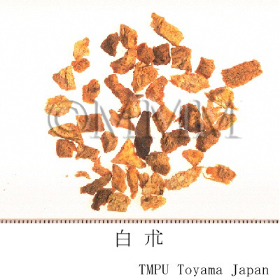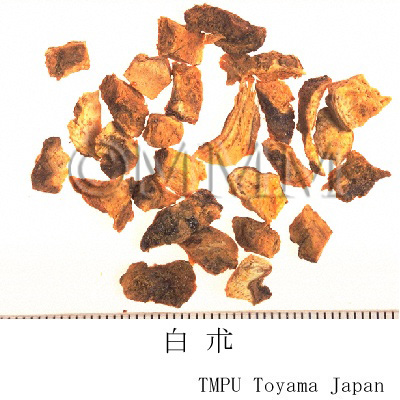 | Remarks | Both Japanese and Korean Baizhu (白朮) are the barked rhizome of Atractylodes japonica, which are called, in Japanese name, "Miyoshibyakujutsu", "Tamabyakujutsu", "Donkonbyakujutsu" and others. Though the origin of all Chinese Baizhu is Atractylodes macrocephala, they have various names such as "Zhezhu", "Tianshengzhu", "Dongzu, "Yezhu" etc. depending on the production areas and the processing methods. These are listed in the Pharmacopoeia of People's Republic of China as Baizhu (Atractylodis Macrocephalae Rhizoma, Largehead Atractylodes Rhizome). In Japan, occasionally, the Japanese Baizhu is called "Wabyakujutsu" and the Chinese one is called "Tōbyakujutsu". The main component of essential oil in both Baizhu is atractylone. The medicinal properties of Baizhu and Cangzhu (蒼朮), a related drug, are the same as long as their actions are to strengthen the function of the stomach and eliminate dampness. However, Baizhu tends to have the advantage of the former property and Cangzhu is said to be good at the latter (to alleviate water retention, inducing diuresis and diaphoresis). Therefore, Baizhu is used to treat deficiency in the spleen of the insufficiency symptom complex, and Cangzhu is used to treat excessive pathogenic heat of excess syndrome. | |||||