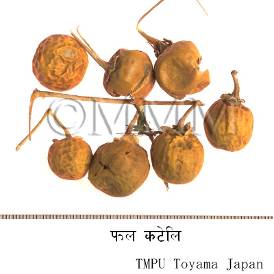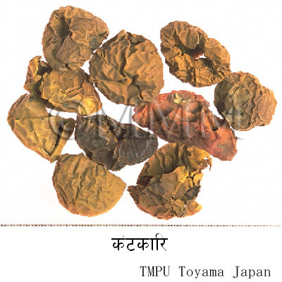 | Crude drug name | Ayurvedic name or Sanskrit name, English name | Kantakari (Fruit), Febrifuge Plant, Yellow Berried Nightshade, Prickly Egg Plant | ||||