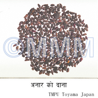 | Traditional usage | 1. Fruit juice of Dadima (Punica granatum) along with honey is good for diarrhoea/diarrhea. 2. In severe fever caused by Pitta one should take parched grain flour mixed with fruit juice of Dadima. 3. Decoction of the bark of Dadima and Kutaja (Holarrhena antidysenterica) mixed with honey checks severe diarrhoea with blood immediately. 4. In case of dysentery, the patient should take diet consisting of vegetables prescribed in constipation, meat soups with profuse fat and processed with curd and pomegranates and Sali rice cooked with sesamum, black gram or green gram. 5. Ripe fruit of Dadima should be cooked in close heating. The juice so extracted checks all types of diarrhoea. 6. Fruit rind of Dadima is used as decoction for bleeding piles. 7. Decoction of Kutaja bark and Mustaka (Cyperus rotundus) checks bleeding. Similarly acts the fruit rind of Dadima and Mustaka and also Candana (sandal). 8. Ghrta (Ghee) cooked with pomegranate juice and Yavaksara (alkali of Hordeum vulgare) checks bleeding and pain. 9. Linctus made of Dadima seeds, Jiraka (cumin) and Nagakesara (Mesua ferrea) mixed with sugar and honey alleviates excessive thirst. 10. The paste of sarkara (jaggery) and Dadima or Draksa (grapes) and Dadima should be kept in the mouth. It removes dryness and tastelessness of mouth. 11. After food, wine scum of Dadima juice or decoction of Pancamula* or infusion of Dhanyaka (coriander) and Sunthi (dry ginger) should be given to quench thirst. 12. After observing fast, churned drink rough, sweetened with honey and sugar, slightly soured with Dadima and Amalaka (Phyllanthus emblica) and added with Parusaka (Grewia asiatica), Mrdvika (grapes) and Kharjura (date) should be given along with boiled water. 13. In freckles, fresh rind of Dadima with goat's milk should be applied. 14. In case of anorexia, soups mixed with sour juice of Dadima are wholesome. 15. Infusion of fruit rind of Dadima mixed with sugar should be taken for gonorrhoea/gonorrhea. 16. In soft chancre, scrotum should be dusted with the powder of the leaves of Bandhuka (Pentapetes phoenicea) and bark of Dadima or the paste of Puga fruit should be applied. Pancamula*, a group of five roots of Salaparni, Prsniparni, Brhati, Kantakari and Goksura, used for the treatment of all major fevers. | |||||