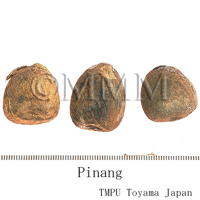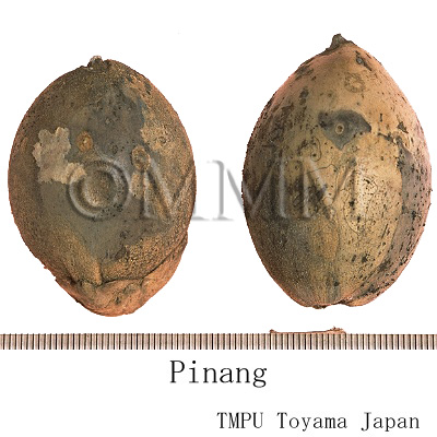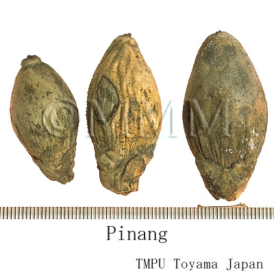 | Remarks | [DNA sequences] AB271407, AB271408 Eventhough there is still unclear scientific evidence, it is believed that betel nut use refer to a combination of the nut, Piper betle vine and lime can lead to stimulant and euphoric effects and this is the reason why betel nut chewing becomes popular [Medlineplus]. North Sumatera (Indonesia) was an important production area of various grades of catechu: seeds from different species of catechu: pinang bunga, pinang cang, pinang kasar, pinang belah and pinang bulat. Each varieties has different shape of seeds [201]. | |||||