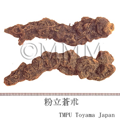 RemarksMaozhu (Hancangzhu) is A. lancea (Jap. name: Hosobaokera), produced in Hubei, Jiangxi, Jiangsu Prov. and others. Jincangzhu (Shancangzhu) is A. chinensis (Jap. name: Shinaokera), produced in Hebei, Henan and Jiangxi. North Korean Cangzhu is A. koreana Kitam. (= A. lancea DC.var. simplicifolia Kitam.), Jap. name: Nanman'okera, produced in Jilin, Liaoning, north part of Korean peninsula and Japan. Cangzhu produced in Maoshan of Jiangsu Prov. is very famous for its high quality. Though the cotton-like white separation of the essential oil on the surface is often misjudged as fungus, it is the mixed crystal of beta-Eudesmol and Hinesol, which is a proof of the high quality.