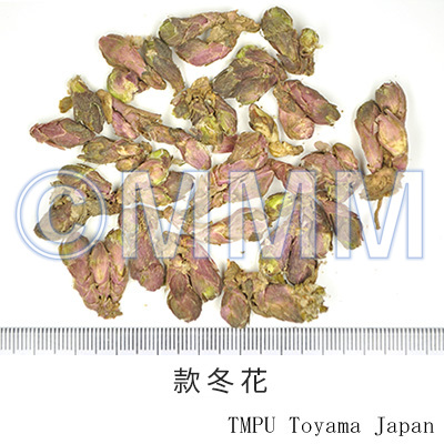 | Remarks | The leaves of Tussilago farfara L. ( Jap. name: Fukitampopo), which directly grow from the root are called Kuandongye, and the root of it is called Kuandonggen. They are used as antitussive and expectorant, as well as Kuandonghua. Fukitampopo is well distributed in the continent of Eurasia. The leaves are called Farfarae Folium in Europe and are applied to relieve coughs such as bronchial catarrh. Long ago, Dioscorides said "If you put the beaten leaves on rubors on the skin, erysipelas and all the other inflammatory regions, they will be cured. It will cure the people who are orthopneic because of dry cough or other transient reasons, if they fumigate dried leaves and inhale the smoke through a pipe. The smoke also induces expectoration of abscess in the lung. The fumigated smoke of the roots has the same benefits. If a pregnant woman drinks the brewed roots with honey water, she will abort a dead fetus." Since then, these benefits have been handed down. Wakantōka, Japanese Kuandonghua, is the flos of Petasites japonicus (Sieb. et. Zucc.) Maxim., butterbur of family Compositae. Generally, it is sold as Fukinotō and is also used to alleviate cough and remove phlegm. | |||||
