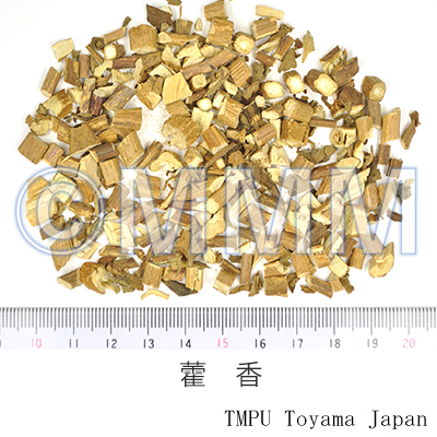 RemarksHouxiang (Jap. name: Kakkō or Kōkakkō) is a medicine of Indian origin. The plant name Pachouli is from Hindi. It was carried to Guangzhou by Chinese abroad more than 100 years ago and cultivated there. Since it is produced mainly in Guangdong and Hainan, it is called Kōkakkō in Japan (Japanese pronunciation of Guang'広' is Kō.). The one produced in Sichuan Prov. is the whole plant of Agastache rugosa (Fisch. et Mey.) O. Kuntze of family Labiatae (Jap. name: Kawamidori). It is called Dokakkō or Senkakkō.