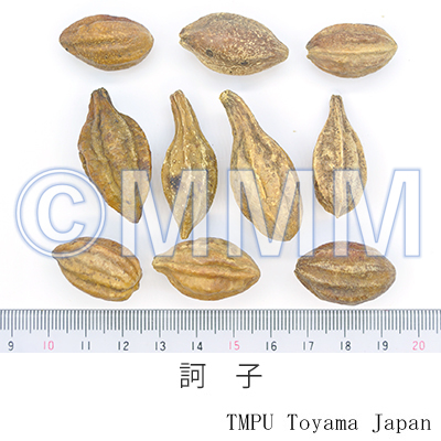 RemarksIt is one of the important drugs of Ayurveda, traditional Indian medicine, and the crude drug name is Haritaki. There are seven kinds of Haritaki depending on its shape or locality. It is said that Vijaya, which is roundish and produced in Himalaya, is the best quality. In India, it is used to treat chronic constipation, chronic ulcer, apepsia, bronchitis, cough, asthma, hoarseness, diarrhea, parasite, hemorrhage, etc. The formulation which consists of Haritaki, Amalaki (Yuganzi in Chinese, Yokanshi in Japanese) and Bibhitaki (Maohezi in Chinese, Mokashi in Japanese) is called Triphala (a group of three fruits), and is used as powder medicine, drink and other forms for tonicity and anti-aging. Haritaki was introduced into Tibet. The crude drug name in Tibet is A-ru-la or A-ru. In Tibetan medicine, it is an all-purpose cure and the symbol of Medicinal Buddha. In China, it was listed in Xin Xin Ben Cao, published in Tang Dynasty, under the name of Helile (Kariroku in Japanese) at the first place. However, it might have been used earlier than that period. Kariroku had been carried to Japan in Nara Period by Jianzhen (Ganjin bonze).