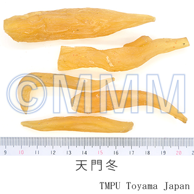 | Remarks | In the market, the root of Asparagus cochinchinensis (Lour.) Merr. (Jap. name: Kusasugikazura) as well as that of A. lucidus Lindl. var. pygmaeus Makino, A. filicinum Ham. (Jap. name: Tachitemmondō) and A. schoberioides Kunth (Jap. name: Kijikakushi) may be distributed. Tianmendong has a strong effect of nourishing the lung and kidney. Maimendong (Ophiopogonis Tuber) has an advantage of clearing away heat and relieving dryness of the lung. Both are applied in the combination for the cough of lung tuberculosis. | |||||