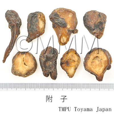RemarksThe Pharmacopoeia of the People's Republic of China defines "Fuzi (附子)" as the processed tuber (lateral roots) of Aconitum carmichaeli. The processed aconite root, which is compressed and heated, is used for many kinds of Kampo drug products. Since aconitum alkaloids have strong toxicity, there are many processes to reduce it. It is called "Yanfuzi (塩附子)," "Paofuzi (炮附子)," "Heifupian (黒附片)" or "Baifupian (白附片)" depending on each process.