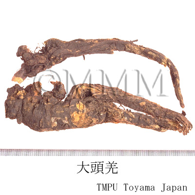 RemarksKenkyōkatsu, produced in Korea, is the root or rhizome of Ostericum koreanum Kitagawa (= Angelica koreana Maxim.) of family Umbelliferae (Jap. name: Chosen'oniudo) or Ostericum grosseserratum Kitagawa (= Angelica uchiyamana Yabe) (Jap. name: Nioiudo).