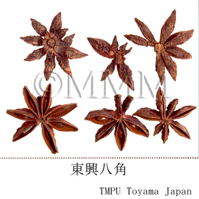 | Remarks | - The benefit of Bajiaohuixiang (Jap. name: Daiuikyō) resembles Xiaohuixiang (Jap. name: Shouikyō). However, Daiuikyō has the heat property which warms the organs strongly, dispels cold and relieves pain. - The fruit of Ilicium religiosum Sieb. et Zucc. (Jap. name: Shikimi), produced in Japan, is the congener of Daiuikyō. Though it resembles Daiuikyō closely, it has a toxic component anisatin. Therefore, it must not be mixed with Daiuikyō. | |||||