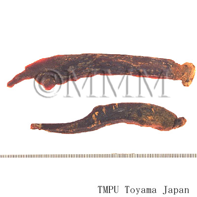 | Remarks | There are two kinds of Hongshen. One is steamed and dried Hongshen which fine roots have not been removed (Japanese Hongshen). The other is dried and pressed Hongshen without fine roots (North Korean and Korean Hongshen). In China, the processed Hongshen with relatively long branching roots is called "Biantiao Hongshen" and the one without fine roots is called "Hongshenxu". | |||