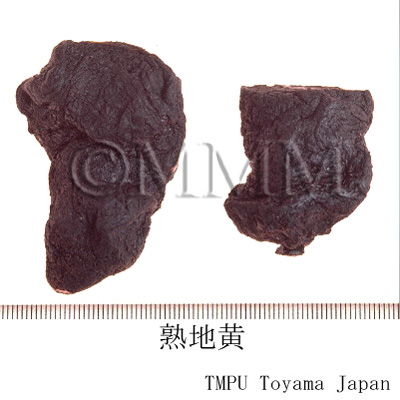 | Remarks | "Shudihuang" is processed with wine: it is made by steaming after mixing with "Huangjiu", a kind of rice wine such as "Shaoxingjiu". Then it is dried by daylight. This process, steaming and drying, is repeated 9 times. Steamed "Shudihuang": it is made by steaming without "Huangjiu". The steaming and drying process is repeated 9 times too. Comparing with "Kanjiō" (Unprepared Rehmannia Root), "Shudihuang" tends to have less or no iridoid glycoside such as catalpol, and has more monosaccharides. | ||||||