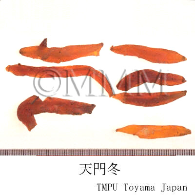| Remarks | In the market, the root of Asparagus cochinchinensis (Lour.) Merr. (Jap. name: Kusasugikazura) as well as that of A. lucidus Lindl. var. pygmaeus Makino, A. filicinum Ham. (Jap. name: Tachitemmondō) and A. schoberioides Kunth (Jap. name: Kijikakushi) may be distributed. Tianmendong has a strong effect of nourishing the lung and kidney. Maimendong (Ophiopogonis Tuber) has an advantage of clearing away heat and relieving dryness of the lung. Both are applied in the combination for the cough of lung tuberculosis. | |||||