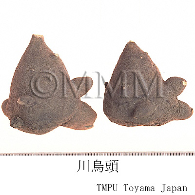 | Remarks | - The tubers of wild Aconitum have respective names depending on the production area and species, as follows: Sōuzu (Jap. name), Caowu, Wuyao, Jinniuqi, Dacaowu, Xiaoheiniu, Xuewu, Huangcaowu, Tengcaowu, Wanwuyao, Kaenshi (Jap. name), Tiebangchui. - Various kinds of Chinese Souzu: A. kusnezoffii (Heilongjiang), A. artemisaefolium Bar. et Skv. (Liaonig), A. paniculigerum Nakai, A. sczukini Turcz. (Northeast part), A. taipeicum Hand.-Mazz. (Shaanxi), A. karakolicum Rap., A. soongaricum Stapf (Xinjiang), A. sungpanense Hand.-Mazz. (Shaanxi, Gansu, Sichuan), A. hemsleyanum Pritz. (Sichuan, Hubei, Hunan, Shaanxi), A. stylosum Stapf, A. transsectum Diels, A. delavayi Franch. (Yunnan) and many other tubers of genus Aconitum. - Korean Sōuzu: Tubers of several Aconitum genus such as A. triphyllum Nakai (Jap. name: Mitsubatorikabuto). - Japanese Sōuzu: The tuber of A. japonicum Thunb. - The Pharmacopoeia of The People's Republic of China contains Chuanwu, the parent root of A. carmichaeli (harvested from late June to early August), and Caowu, the tuber of A. kusnezoffii (harvested in Autumn). Caowu is stronger in both toxicity and benefit than Chuanwu. Compared with Fuzi, Wutou has advantages of expelling wind and relieving pain, and has disadvantages of stimulating heart and dispelling cold. | ||||||