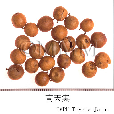 | Remarks | The origin of using the fruit of Shironanten (Nandina domestica var. lleucocarpa) or Nanten (Nandina domestica) as an antitussive in Japan is not clear. However, it seems that the knowledge was not brought from China. There are Shironanten and Akananten in the market. Since Shironanten which bears white fruit is more appreciated in the market, bleached red fruits of Nanten are mass-marketed. They have no luster nor lamina, and the pericarp is thinner. | |||||